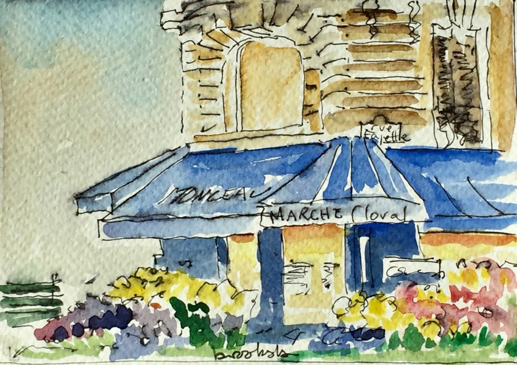 Monceau Fleurs are all over Paris, in some prime spots. Check out their website Monceau Fleurs Paris. This one is near gare du l’Est. I drew it in the rain last year when I was waiting for my kid during her dance lesson.