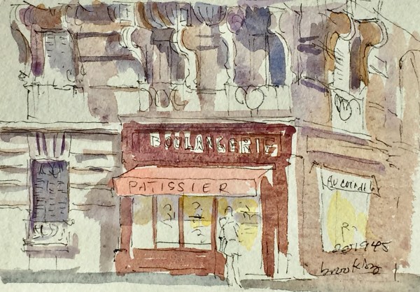 The boulangerie is the French tradition, pain raisins, pain chocolats, quiches. Each one has its speciality. This one is well stocked. They have a door in and a door out.