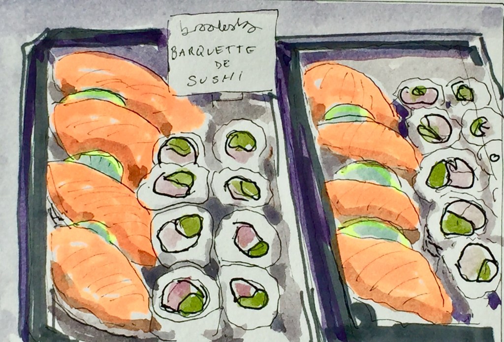 Right accross from Les Confisieries de Mouffetard, on rue Mouffetard. There is a chinese takeout where it’s possible to get these sushi boxes.