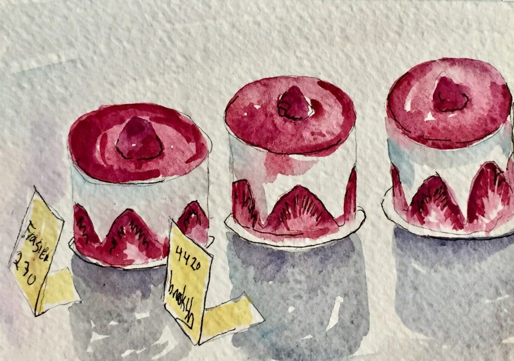 This is like an Italian Bavarese. It sort of melts in your mouth. They were in a boulangerie over in the 11th on rue Oberkampf. Very close to the awesome yoga studio Māyāshala. If you do yoga Māyāshala is the place to be. I love watching their instagram feed, sometimes you can find the owners posing with a gas station attendant or in a clothes washer. And then of course if you walk down rue Oberkampf you can get one of these Fraisier for half the price of what they sell them in the 17th.