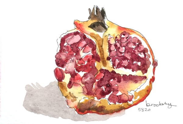 This pomegranate was delicious to eat and a delight to paint. The winter light my painting shelf. It looks paradise but in reality my assistants are flying around like maniacs and Baby girl likes to chomp on my toes.