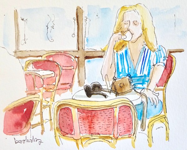 Did you notice? She has two right hands. This was painted live, in Paris when I was on my lunch break from teaching English. I am happy that is in the past, it was fun for a while and a great experience. The cafe was on Avenue de Ternes. That’s a big busy street that goes straight west to La Defense.