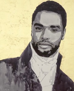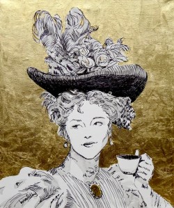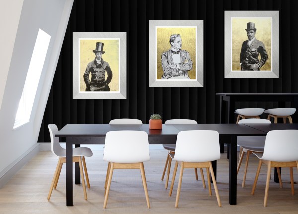 The gilding on these pieces makes them interactive, they reflect everything, but they don’t listen to you. They seem to light up when the sun goes down. The eyes of the Golden Yogi Sadhu seem to stare at you no matter how far to the side of the canvas you are. I wouldn’t be surprised if he had eyes in the back of his head. Milady Hilda has got secrets. And she’s dying to let you know. She’s sassy. I asked my girlfriends what to name her, we had a great laugh but I won’t tell you what we said. It’s a secret. James is looking down his nose. That doesn’t mean anything, maybe his top hat is too big. Sugar Daddy is cool. And Peter Jackson was world famous boxer who was born a free man in the late 1800’s.