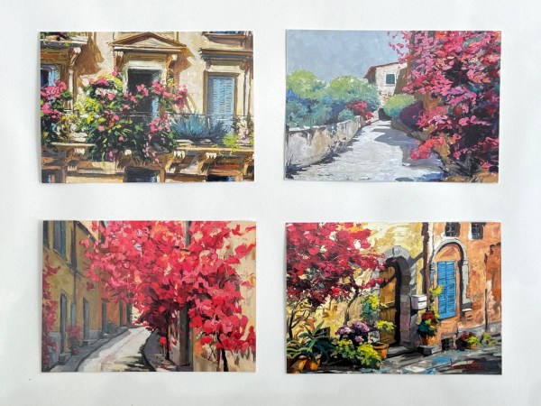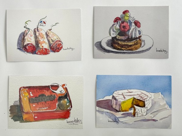 I’ve printed up the first series of postcards from my illustrations. I plan to put them up on Etsy in groups. Here is a sneak peek. They cost 3 euro each or 10 euro for 4. Shipping is extra. Some are from my watercolor and pen and ink. Others derive from my oil paintings. My favorite is the three sausages. The name of the brand is Les Trois Porcs. I don’t eat sausage. I did the drawing during an art salon where they sold sausage and champagne. My neighbour sold sausages of all shapes and sizes. I showed the watercolor to him. He looked at me like I was from Mars.