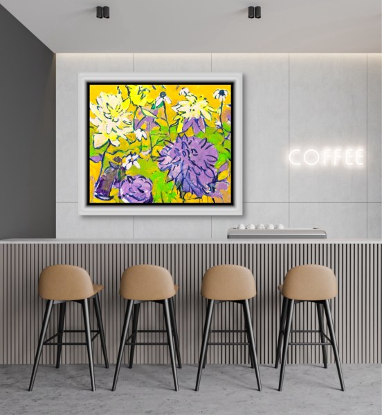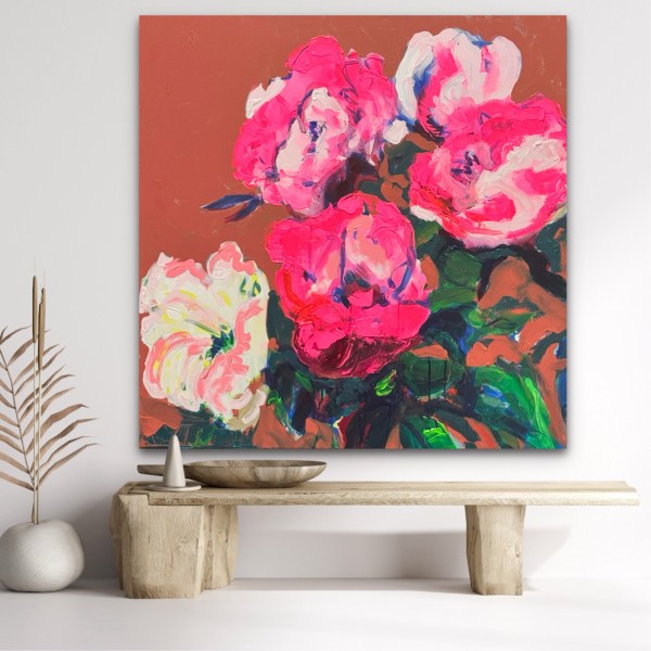 These paintings are created with house paints. Contemporary abstract decor with a floral theme.